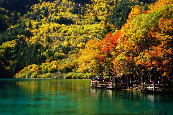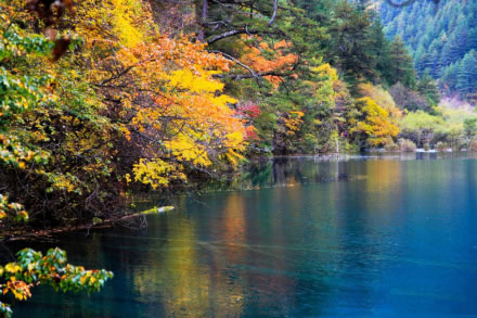 浪漫的秋風(fēng)也吹來了九寨溝最為燦爛的時(shí)節(jié)。山林暈染成色,除了綠色以外,還呈現(xiàn)出金黃、火紅等色彩,五彩繽紛,倒映在明麗的湖水中,湖山同色,湖水也斑斕似錦了,一時(shí)間竟然不能分清哪里是山哪里是水,十分迷人。