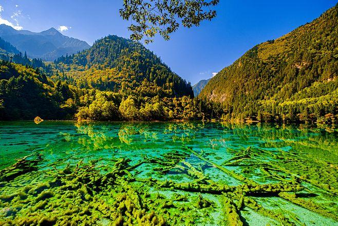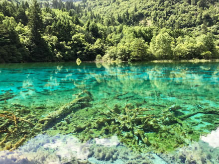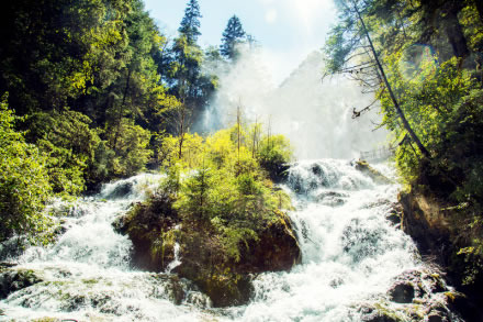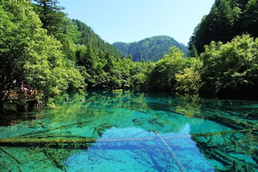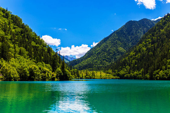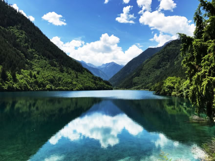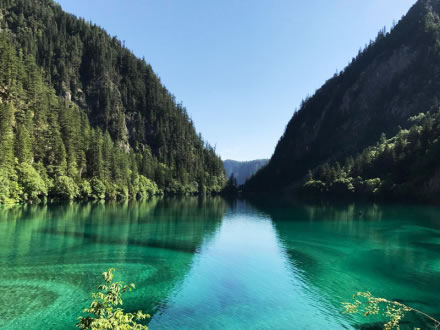炎炎夏日,似火驕陽與粘濕汗水籠罩了整個(gè)大地,而此時(shí)的九寨溝卻截然不同。她掩映在整片整片蒼翠欲滴的濃陰之中,茂盛的林木守衛(wèi)著海子,歡快的流水梳理著樹枝與水草,一切都透著清爽。