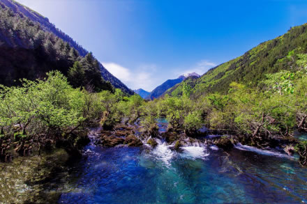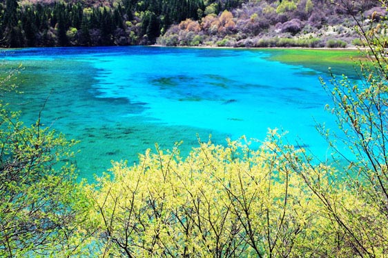 春風(fēng)吹拂,沉睡的九寨溝蘇醒了。冰雪融化,新綠發(fā)芽,春水的顏色映著山色,嬌嫩得讓人不忍探視,仿佛只要輕輕地一口氣都能讓它消失。水邊道旁,鬧哄哄開滿了不知名的美麗山花,桃紅、絳紫、靚藍(lán)、鵝黃,繁華似錦,爛漫一路。溫柔而慵懶的春陽吻接湖面,愛撫春芽,也悸動(dòng)了你久閉的心門......