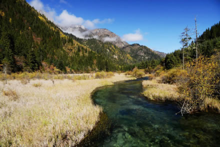 盆景灘海拔2190米,長(zhǎng)218米、寬98米,水深0.8米,是進(jìn)入九寨溝的第一個(gè)灘流景觀。淺灘上,柳、柏、楊、松,杜鵑等植物叢生,綴以花草、石塊,樹干四周因鈣華堆積形成略高于水面的天然盆堤,宛若一組組盆景。