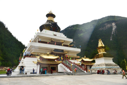 目前,九寨溝景區(qū)僅保留了樹正寨、荷葉寨、則查洼寨這三個(gè)村寨,善良淳樸的他們,用微笑迎接著前來九寨溝的每一個(gè)人。而在這些村寨中,最壯觀的莫過于樹正寨前的“九寶蓮花菩提塔”,七彩經(jīng)幡隨風(fēng)飄蕩,圣潔的白塔在陽光下仿若閃著光,這里也是眾多游客到來時(shí),都會(huì)雙手合十,輕聲祭拜的地方。