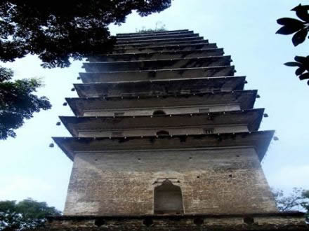 靈寶塔又名凌云塔,因其聳立在凌云寺后的靈寶峰巔,故以山峰命名。塔建于唐代,塔形呈密檐式四方錐體,磚砌而成,坐東向西,高38米,共十三級。塔體中空,內(nèi)確 ”石階沿塔軸盤旋至頂。塔頂為四角攢尖式。靈寶塔的結構和風格與西安小雁塔相似。