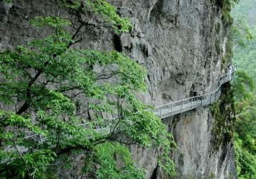 棧道開鑿于1983年初,1984年竣工,同年十月開放,全長約500米,北端與大佛相連,南端與碧津樓相連,與大佛右側的九曲棧道一起構成一條回環(huán)曲折的旅游路線。
