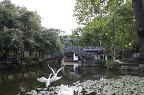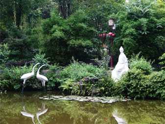 過(guò)蓮池旁的“山谷小憩”,亦為園中一景。其間,黃庭堅(jiān)身著便裝,手拿書(shū)卷,在池旁靜坐沉思。兩只白鶴立于水中相伴,此景也稱“雙鶴伴涪翁”,優(yōu)雅清新,寓味深長(zhǎng),形象地表現(xiàn)了黃庭堅(jiān)在謫居戎州時(shí),平和豁達(dá)的心態(tài)。