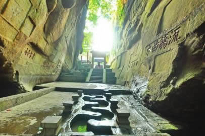仿照東晉書(shū)法家王羲之蘭亭集會(huì)流觴曲水的意境,黃庭堅(jiān)利用這峽谷的地形和天然泉水,修建了900多年來(lái)遐邇聞名的流杯池。保持其天然的山水景致是文人造園崇尚自然的山水理念,流杯池內(nèi),從谷底到崖壁頂,蜿蜒臺(tái)階而上,幾個(gè)平臺(tái)錯(cuò)落其間,時(shí)而寬敞平緩,時(shí)而臨崖高懸,這樣的美景是黃庭堅(jiān)在領(lǐng)會(huì)自然美的規(guī)律上進(jìn)行的藝術(shù)再創(chuàng)造。