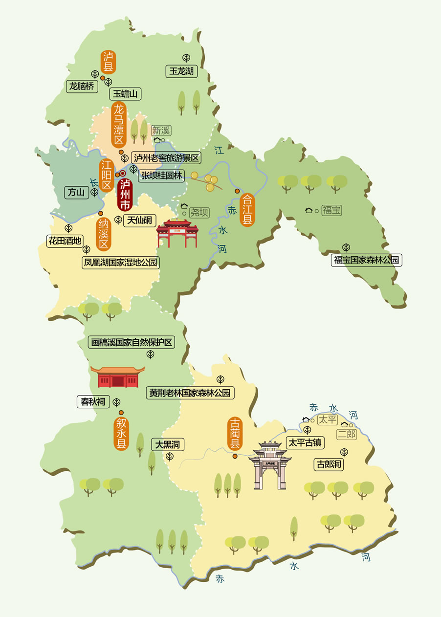 著名景點:張壩桂圓林公園、瀘州方山旅游區(qū)、四川福寶國家森林公園、太平古鎮(zhèn)、鳳凰湖旅游景區(qū)、蔣兆和故居、瀘州老窖旅游區(qū)