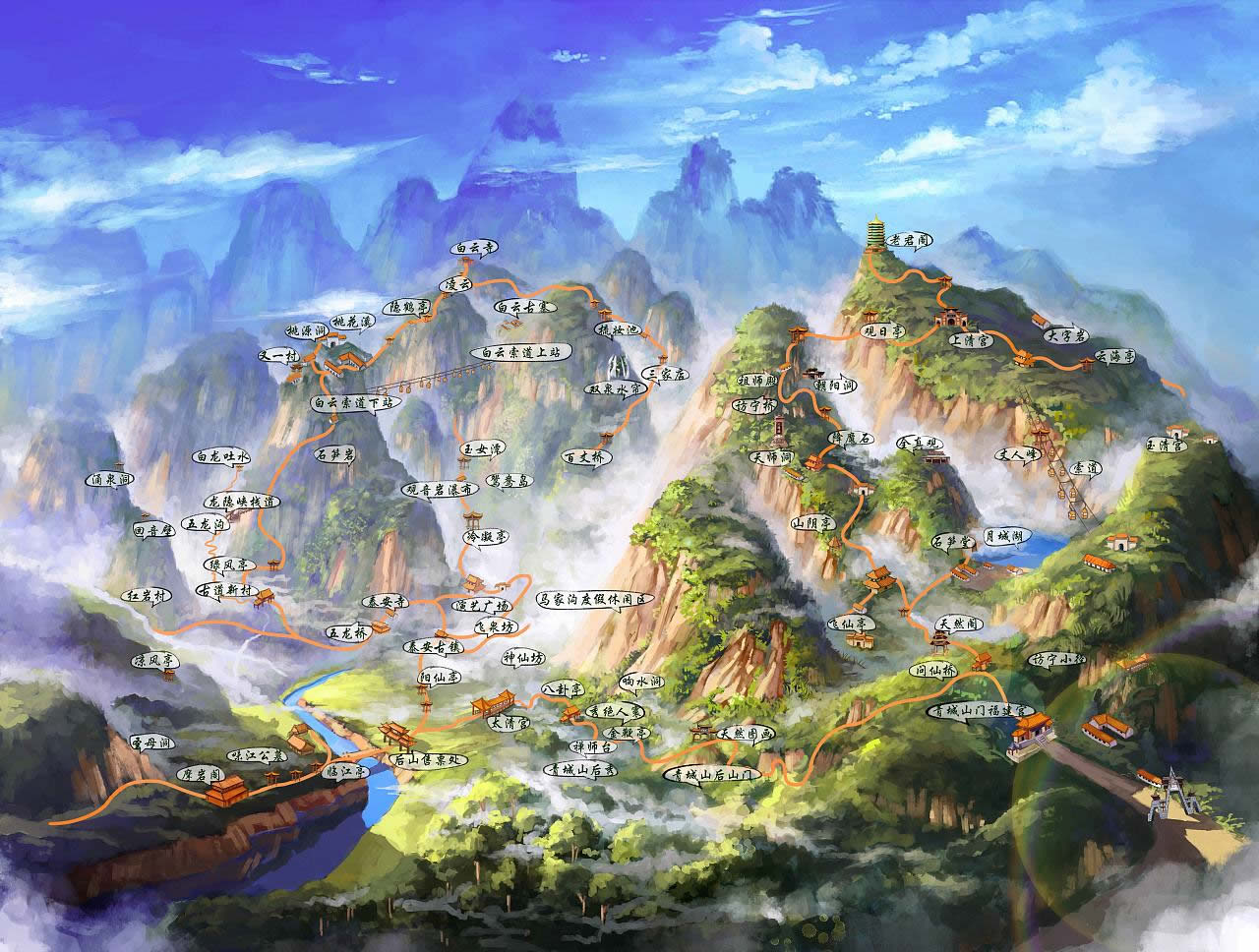 前山以常觀、上清宮為核心,宮觀相望。建福宮、祖師殿、朝陽洞等人文景觀與金鞭巖、石筍峰、丈人山等自然風(fēng)光彼此增色。主要景點為老君閣、月城湖、天師洞、上清宮、五洞天、仙履清涼、碧翠青城、天然圖畫、祖師殿、朝陽洞、圓明宮、建福宮。