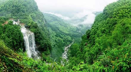 七彩飛瀑又名落魂臺(tái)!督部h志》載:“萬嶺箐南北飛瀑,殆似廬山”。不擇地而出的泉水,使得深邃幽深的竹海充滿靈氣,山巖跌宕處,每每作了懸泉飛瀑。山間數(shù)十條姿態(tài)各異的瀑布中,最為壯觀的,當(dāng)數(shù)七彩飛瀑。七彩飛瀑處在石鼓山和石鑼山之間的葫蘆谷中,從深林里流出的水潦河,在回龍橋下分為四級(jí)瀉下懸崖,落差近200米,蔚為壯觀。瀑布上頭,還有石龍過江、孟獲墳、古較場(chǎng)等景點(diǎn)。一湖碧水映藍(lán)天翠竹;湖水的寧靜,與瀑布的飛動(dòng)相互映照。