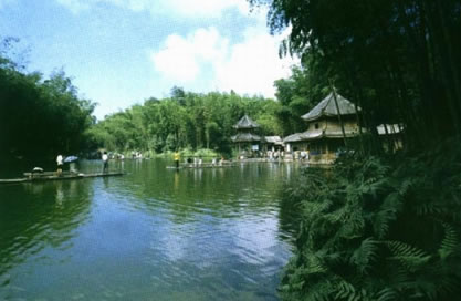 湖中有兩座不同的原形小島。湖水碧綠清澈,四周翠竹掩映,綠草如茵,附近有梅坪、古佛洞、涼風(fēng)洞、照妖鏡、七疊石等古跡。當(dāng)太陽起落時(shí),滿湖金色,萬道霞光,絢麗多彩。湖上可蕩舟劃筏,湖邊亭閣,也可品茗小酌。夏秋之夜,山巒沉郁而秀朗,清風(fēng)徐來,漣漪翩翩,湖邊納涼閑話,別有情趣。