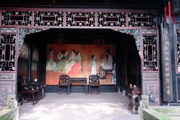 工字廳的正前方有一臺(tái)階。臺(tái)階上方是戲臺(tái)。臺(tái)前立柱上有一副對(duì)聯(lián):“移影換形儼然君臣父子,假哭真笑表達(dá)離合悲歡”,構(gòu)思精妙,立意深刻,無(wú)聲地向人昭示:這里是戲劇的天地。臺(tái)口左右華板上雕刻著《白蛇傳》中的“船舟借傘”和《西廂記中》的“鶯鶯聽(tīng)琴”。人物形神畢現(xiàn),栩栩如生。臺(tái)前的落地罩精致絕倫,有關(guān)專家學(xué)者稱贊其“集中國(guó)民間傳統(tǒng)木雕之精華”,自是當(dāng)之無(wú)愧,其雕刻內(nèi)容,有歷史故事,如“黃道州發(fā)兵抗清”;有戲劇故事,如“別窯從軍”;有的取材于唐詩(shī),如“尋隱者不遇”、“清明詩(shī)”等,有民間傳說(shuō),如“羊有跪乳之恩、烏有反哺之義”;有的采用諧音、象征手法表現(xiàn)美好的意愿的傳統(tǒng)圖案,如“掛印封候”、“富貴白頭”、“路路通順”等。