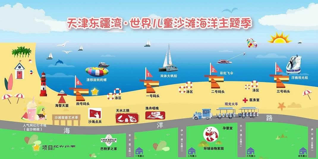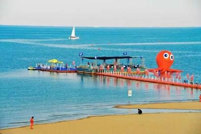 景區(qū)還將增添激情水上飛碟、快艇漂移、水上沙發(fā)、水上UU船、帆船、海上滑梯、海上蹺蹺板等數(shù)十項(xiàng)大型游樂設(shè)施,讓這里真正成為海上“迪士尼”。作為配套設(shè)施,在人工海灘西側(cè)修建濱海路,全長(zhǎng)1.3公里,道路寬24米,為景區(qū)內(nèi)步行觀景道路,道路兩側(cè)綠化面積約6700平方米。綠化廣場(chǎng)總面積12萬(wàn)平方米,景區(qū)停車場(chǎng)總面積約4700平方米。景區(qū)設(shè)置為沙灘親水區(qū)、沙灘游泳休閑區(qū)、水上運(yùn)動(dòng)休閑中心和水上休閑娛樂區(qū)。其中,位于沙灘游泳休閑區(qū)已經(jīng)建成的海景會(huì)所,是目前國(guó)內(nèi)北方最大的單體木結(jié)構(gòu)海景酒店會(huì)所,設(shè)有餐飲、住宿、淋浴、商務(wù)、娛樂等設(shè)施,并提供有地道的天津狗不理包子。另外,會(huì)所周邊正在建設(shè)游艇會(huì)所、五星級(jí)酒店、運(yùn)動(dòng)廣場(chǎng)、低密度住宅、高爾夫球場(chǎng)等設(shè)施。配套服務(wù)設(shè)施將逐步完善。