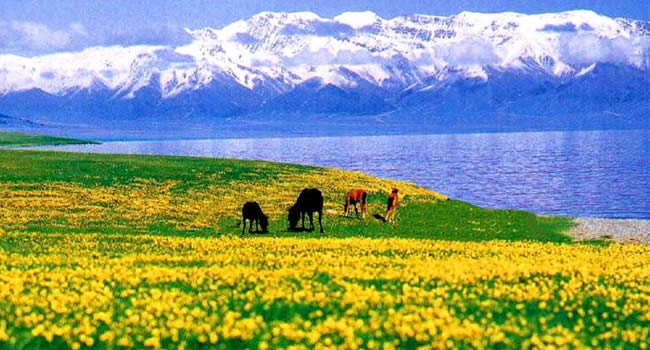 賽里木湖古稱“凈!,位于中國(guó)新疆博爾塔拉州博樂(lè)市境內(nèi)的西天山山脈中,緊鄰伊犁州霍城縣,是一個(gè)風(fēng)光秀美的高山湖泊。賽里木湖湖面海拔2073米,水深85公尺,東西長(zhǎng)約30公里,南北寬約25公里,周長(zhǎng)90公里,水域面積460平方公里,是新疆海拔最高、面積最大的高山冷水湖。 [16]賽里木湖蒙語(yǔ)稱“賽里木淖爾”,意為“山脊梁上的湖”,面積約458平方公里,水質(zhì)透明度達(dá)10—12米。