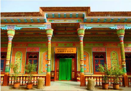 這座民族特色濃郁,極具刀郎人建筑風(fēng)格的宴藝廳就是刀郎部落招待貴賓及聚會、就餐、欣賞刀郎歌舞的場所。餐廳裝飾工藝主要為刀郎人傳統(tǒng)的石膏雕、木雕和磚雕。墻面上色彩艷麗,植物花卉圖案的是石膏雕,回廊上的木柱子為木雕,據(jù)說這樣的一根柱子需要兩個工匠花一個月時間才可完成。屋檐最上面一層為磚雕。刀郎部落宴藝廳可容納300人就餐,在品嘗地道刀郎美味的同時還可欣賞刀郎歌舞表演。