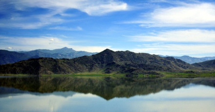伊雷木湖位于額爾齊斯河與卡伊爾特河交匯處,湖面面積212.5平方千米,海拔1120米,蓄水1.13億立方米,水最深處約100米,從空中俯瞰呈巨大的"8"字形,是富蘊(yùn)大地震斷裂帶上最大的堰塞湖。湖東西兩側(cè)雄峰屹立,南北兩側(cè)綠樹環(huán)繞,良田萬頃,村舍鑲嵌。湖面中央被東西兩座大山削去大半。