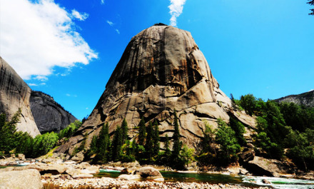 神鐘山,又名阿米爾薩拉峰,為一座如鐘似錐的花崗巖奇峰,在額河南岸平地拔起,海拔1608米,相對高差達(dá)365米,為阿爾泰山山景之最。巖壁縫上生長著白樺樹、青松和西伯利亞云杉。因巖體發(fā)育平行山坡面的同心圓層狀節(jié)理,受寒凍風(fēng)化作用,沿平行坡面的節(jié)理不斷地拆離崩解垮塌,使山峰的表面既圓潤平滑,又十分陡峭,從而形成鐘狀地貌。