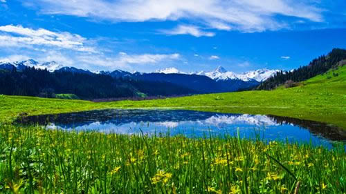從闊谷東側(cè)穿林攀山而上,眼前一望無際,遼闊美麗的草原就是頗具勝名的庫爾德寧大草原。草原上山花爛漫,牛羊蠕動,群馬奔騰,處處都是“風(fēng)吹草地見牛羊”的動人景象;山灣溪畔,密林排映之下是氈房點(diǎn)點(diǎn),炊煙裊裊;極目遠(yuǎn)眺,天際處,皚皚雪峰在陽光照射下,幻化出五顏六色的光芒;齊齊的林線下是郁郁蔥蔥,綿延不絕的茫茫林海;藍(lán)天上,白云朵朵,雄鷹展翅翱翔;在草原西南側(cè),鑲嵌著一面園月以的小湖,水平如鏡,清澈見底,天光云彩,湖中徘徊,詩情畫意油然而生。日暮時分,夕陽如血,霞飛滿天,光移景動,山色朦朧,群山露紅,層林盡染,更是難得的景致。庫爾德寧草原風(fēng)光無限,美麗如畫,令人目不暇接。