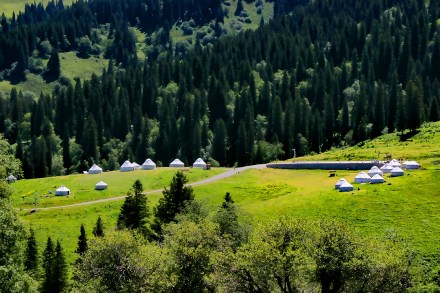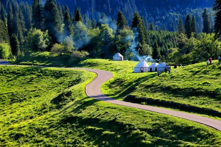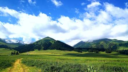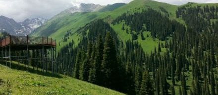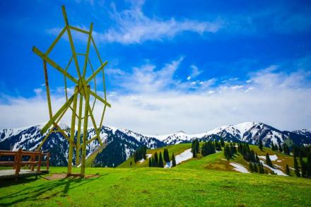 哈薩克語為“美麗的山溝”,是進入河谷草原的第一站,擁有一山四景,白雪皚皚的山峰、茂密的森林、連綿起伏的山丘、平坦的草甸,是草原垂直自然景觀帶的窗口。其東側(cè)的山坡形似天山母親的耳朵,聆聽著大地的聲音,默默守護著天山,被稱之為“天山之耳”。西南側(cè)的山坡形似一匹昂首奔騰的駿馬,見者“馬到成功,飛黃騰達(dá)”被取名為“飛馬坪”。