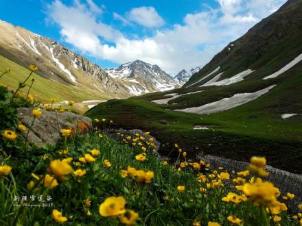 天神臺空谷幽靈,舉目藍(lán)天如洗,白云飄逸,雪山聳立。又名“雪蓮谷”,因海拔達(dá)到了3000米似與神靈同住,讓心靈在圣潔中凈化。又因其在天空中鳥瞰酷似一朵盛開的雪蓮花而得名,周圍險峻的山峰如同雪蓮花瓣,山谷中奇異的鮮花如同雪蓮花蕊。積雪為雪蓮的生長提供了適宜的環(huán)境,每年7、8月份雪蓮花孤傲綻放,獨語高山。