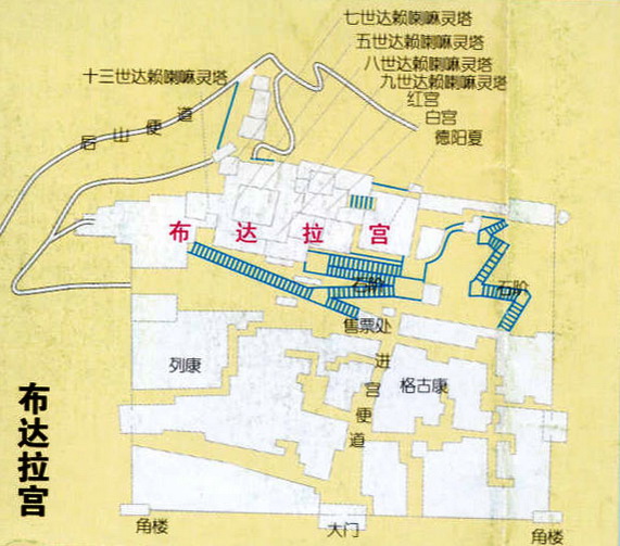 布達(dá)拉宮的基本面貌,主要是公元17世紀(jì)五世達(dá)賴?yán)飼r期重建的白宮及其圓寂后修建的紅宮,“此后歷代達(dá)賴又相繼擴建,終成布達(dá)拉宮今日之規(guī)模!