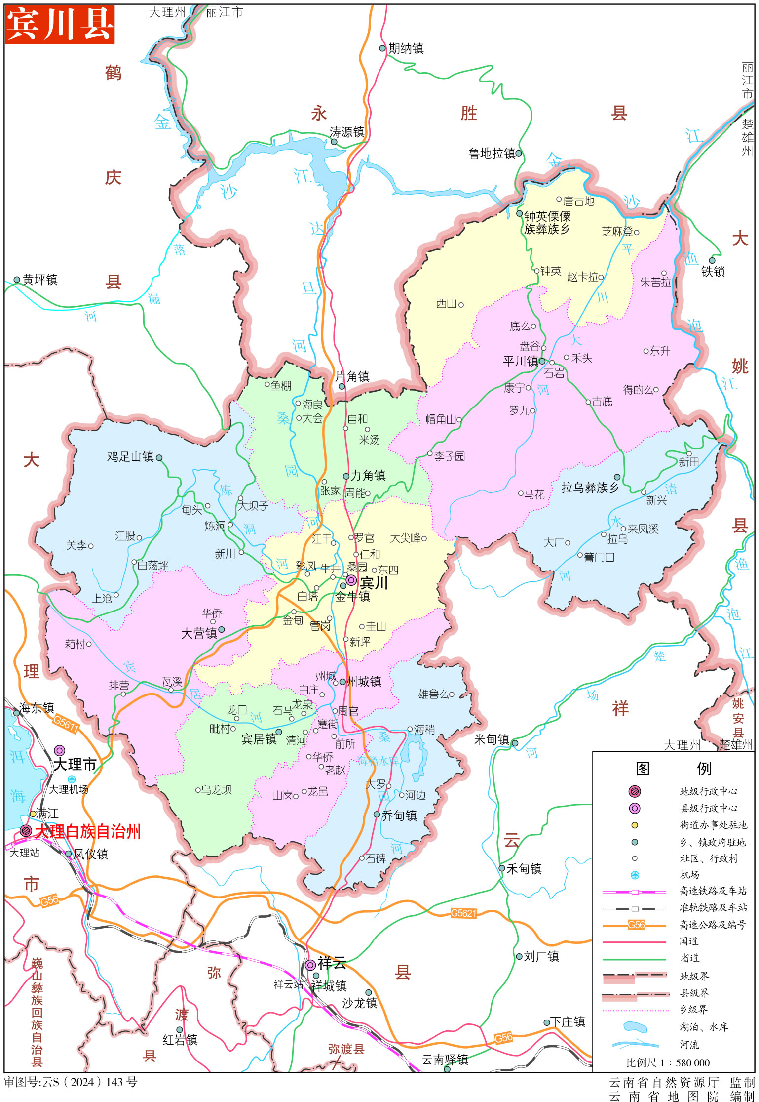 鎮(zhèn):金牛鎮(zhèn)、賓居鎮(zhèn)、州城鎮(zhèn)、大營鎮(zhèn)、雞足山鎮(zhèn)、力角鎮(zhèn)、平川鎮(zhèn)、喬甸鎮(zhèn)