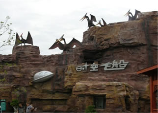 時空飛船:在一個不起眼的洞窟崖壁上有一架墜毀的飛船。進(jìn)入洞窟是一座神秘的飛船發(fā)射基地,從這里就是游客將乘坐“時空飛船”飛越侏羅紀(jì)。飛船會進(jìn)入神秘的時光隧道,游客將親歷地球生命演變和進(jìn)化的過程,在短短10分鐘內(nèi)走完地球生命幾十億年的演化歷程,最后進(jìn)入到侏羅紀(jì)世界。