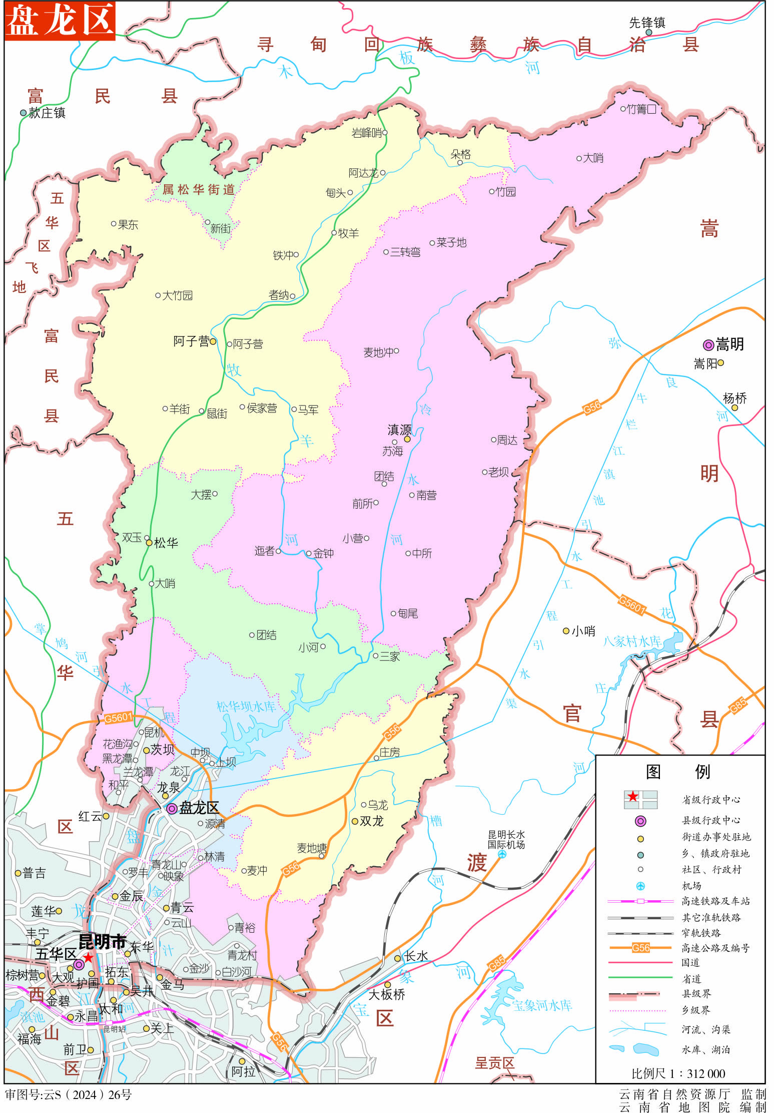 位置境域 盤龍區(qū),位于昆明主城區(qū)東北部,東、南面與官渡區(qū)相連,北接嵩明縣和富民縣,西臨五華區(qū)。轄區(qū)面積861.04平方千米,主城建成區(qū)面積60.96平方千米。