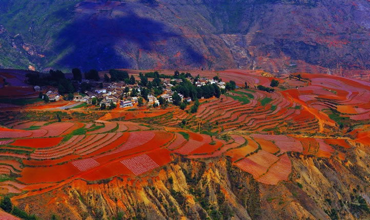 東川紅土地指的是位于昆明市東川區(qū)西南40多公里的新田鄉(xiāng)、有一名叫“花石頭”(109公里程碑處)的地方,這里方圓近百里的區(qū)域是云南紅土高原上最集中、最典型、最具特色的紅土地。