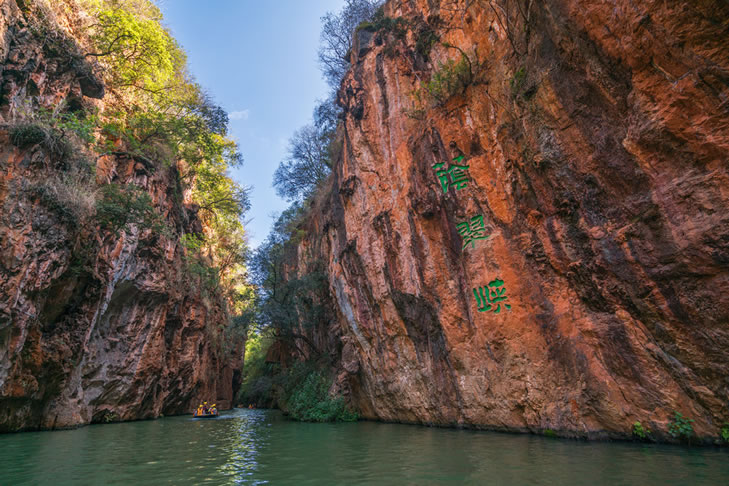 蔭翠峽整條峽長1000米,蔭翠峽風(fēng)景區(qū)全長1公里,是位于昆明東部宜良縣城九鄉(xiāng)的沉潭平湖,最大水深16米。蔭翠峽河道寬度一般的8米至10米,最寬處不到20米。