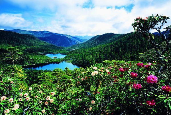 老君山風(fēng)景區(qū)山中的確有九十九個冰蝕湖,而且每個湖又呈現(xiàn)出不同的色彩和姿態(tài),與童話般的“九寨溝”相比,它更多了一分大氣、少了一分矯情。特別在每年的5、6月,漫山的花在純凈得幾乎透明的天空下開放了,遠(yuǎn)遠(yuǎn)看去,就像是一張五彩的草甸。