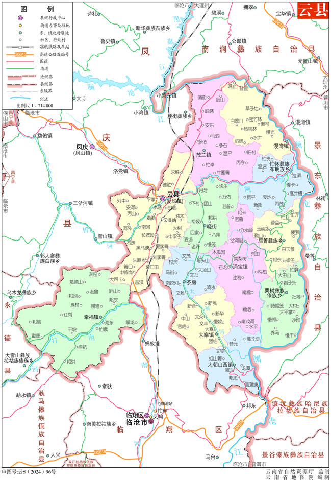 位置境域 云縣位于云南省西南部,東、北與景東、南澗隔江相望,西與鳳慶、永德毗鄰,南與臨滄、耿馬接壤。東西最大橫距84.2千米,南北最大縱距90.4千米,總面積3760平方千米。其中壩區(qū)面積722平方千米,占總面積的19.2%;半山區(qū)面積1343平方千米,占總面積的35.7%;山區(qū)面積1314平方千米,占總面積的34.9%;高寒山區(qū)面積381平方千米,占總面積的10.2%。