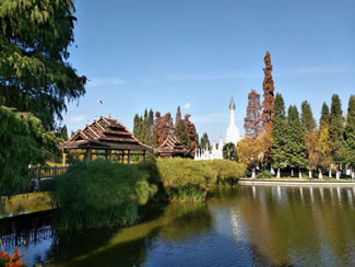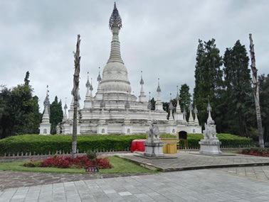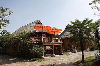 德昂村建筑納入了能容納數(shù)十人居住的德昂大房子,氈帽頂?shù)男》孔,還有頗具浪漫色彩的大公房、小公房……還建有“龍陽(yáng)塔”標(biāo)志及佛教奘房、佛塔。