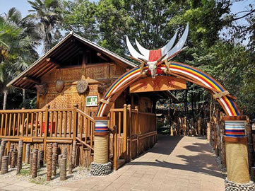 云南民族村景頗寨占地15畝,有寬敞大方的各式民居建筑和精美華麗的”山官房”。建筑形式集中表現(xiàn)了景頗族“干欄式”、“倒T型”等結(jié)構(gòu)特征和布局形制。廣場(chǎng)中央豎立著“目腦縱歌示棟”。圖案和雕塑象征著景頗族人民團(tuán)結(jié)向前的意愿和驍勇剛毅的性格。景頗族信仰萬(wàn)物有靈的原始宗教,信奉鬼神,崇拜祖先。