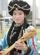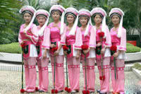 喜穿短衣寬褲,披白羊皮領(lǐng)褂。永勝、寧蒗一帶的婦女喜包大頭帕,扎耗牛尾和絲線盤(pán)于頭頂,穿大襟衣,系百褶長(zhǎng)筒裙,用寬大而染有紅、綠、藍(lán)、黃色的彩帶束腰,