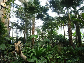 大溫室設計體現(xiàn)了鮮明的時代氣息。共分為四個展區(qū),分別是熱帶植物展區(qū)、溫帶植物展區(qū)、高寒植物展區(qū)(海拔3000米以上的植物)和圖片展覽館。三個植物展區(qū)由小到大,高度依次增加,屋面坡度也依次加大,形成一種螺旋上升的態(tài)勢,暗喻人與自然和諧共存的辯證規(guī)律。立面采用高差變化處理、分段布置,寒帶展區(qū)8─12米高、溫帶展區(qū)10─16米高、熱帶展區(qū)10─20米高,打破了建筑形狀的單調(diào)感。根據(jù)三種氣候帶植物生長環(huán)境及生態(tài)要求,各展區(qū)及內(nèi)部空間高低變化、斜屋面的設置,適宜于植物的合理布局和生態(tài)空間的需要。參觀者既可從室外隔著玻璃觀光,又可進入室內(nèi)與展示環(huán)境充分融合,從不同的角度享受匠心巧作的自然風光。