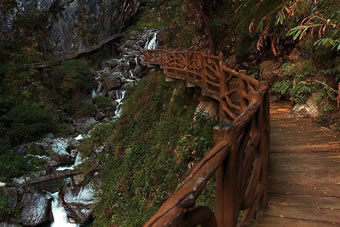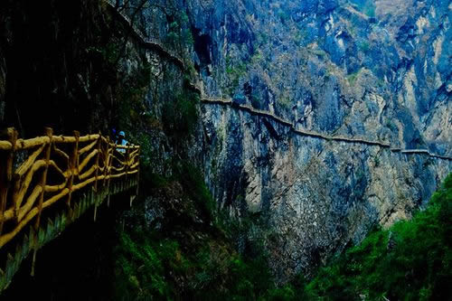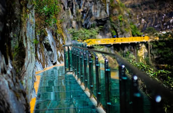 ②高空棧道探險(xiǎn)游路:福緣橋——龍王廟——天開石門——鶴峰亭——五道水服務(wù)區(qū)——高空玻璃棧道——七彩玻璃觀景平臺——高空棧道——七道水彩虹橋——七道水瀑布——野生芭蕉林——百步天梯——萬獸谷——枯木要塞。全長3500米,