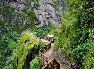 、俨叫杏温罚焊>墭颉埻鯊R——天開石門——鶴峰亭——五道水服務(wù)區(qū)——枯木要塞——萬獸谷——百步天梯——野生芭蕉林——七道水彩虹橋,全長2500米;