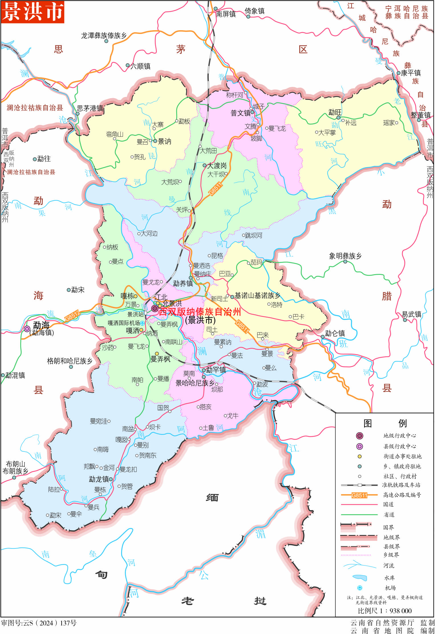 鎮(zhèn):勐龍鎮(zhèn)、勐罕鎮(zhèn)、普文鎮(zhèn)、勐養(yǎng)鎮(zhèn)