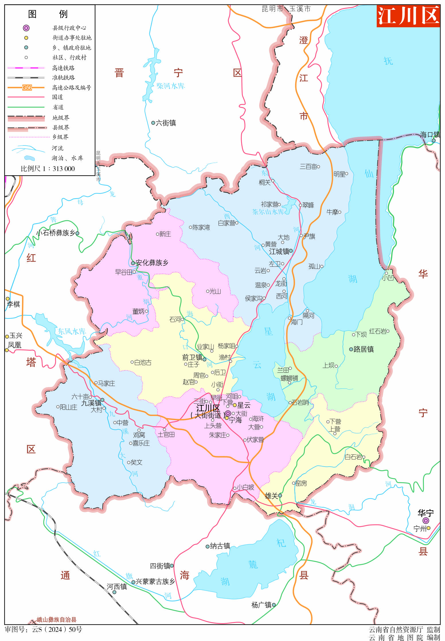 位置境域 江川區(qū),位于云南中部偏東,東南與華寧、通海兩縣交界,西南與紅塔區(qū)接壤,西北與晉寧區(qū)、澄江縣相鄰。東西最大橫距31.9公里,南北最大縱距35.7公里,總面積850平方公里。