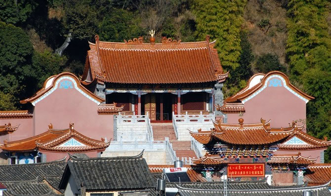 始建于元末,歷經(jīng)明清歷代重建重修,現(xiàn)為清初和清末的建筑。寺中保存下一堂(六扇)木雕槅門,出自清末滇南木雕藝術(shù)家高應(yīng)美之手,槅子門中的構(gòu)圖、布局、人物造型,被省內(nèi)外學(xué)者稱之為“海內(nèi)第一木雕”。三圣宮布局為三進(jìn)式兩院,由大殿、后東西兩廂、中殿、前東西兩廂、前殿(重檐)及前、中、后的六個(gè)躲間組成,外設(shè)圍墻并呈船形,墻外雙溪環(huán)繞而過(guò)。1993年被省政府公布為“第四批文物保護(hù)單位”。