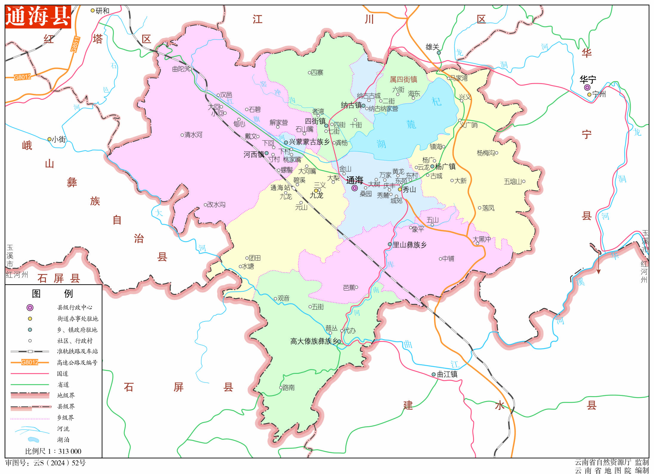 位置境域 通海縣地處云南省中南部、玉溪市東部,東與華寧縣接壤,西與峨山縣、紅塔區(qū)相鄰,南與紅河州石屏縣、建水縣交界,北與江川區(qū)毗鄰。東西最大橫距39.97千米,南北最大縱距36.15千米,總面積721平方千米。距云南省會(huì)昆明市125千米,距玉溪市政府所在地紅塔區(qū)47千米。