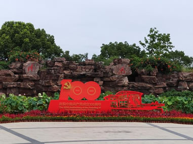 是為紀念中國共產(chǎn)黨第一次全國代表大會在南湖閉幕而建造的一座革命紀念館。作為中共“一大”會址重要場館和黨的誕生地,1959年根據(jù)有關(guān)部門的決定,經(jīng)中央審查同意,嘉興市籌建南湖革命紀念館,不僅仿制了南湖畫舫,還在湖心島建立了南湖革命紀念館,紅船?康暮男u成為最初的館舍,于煙雨樓大廳中開辟中共“一大”史料陳列。1991年7月,為慶祝中國共產(chǎn)黨成立70周年,紀念館移建南湖北岸,由鄧小平同志題寫?zhàn)^名,建設(shè)資金主要由黨員自愿捐獻。建成的紀念館由鐮刀、錘子形組成的紀念性建筑物,占地面積3800平方米,建筑面積1980平方米。紀念館坐北朝南,廣場上有高大威嚴的宣誓臺和大型石雕照壁以及四個火炬型花壇。在鮮花擁簇下,紀念館顯得莊嚴雄偉。沿著臺階進入陳列大廳,正面是一艘南湖紅船模型和“中國共產(chǎn)黨第一次全國代表大會史料陳列”,兩個展廳分別布置了《中國共產(chǎn)黨第一次代表大會史料陳列》、《黨和國家領(lǐng)導人對南湖的關(guān)懷》等陳列,其中包括江澤民、胡錦濤、朱镕基、楊尚昆、宋平、姚依林、彭真等中央領(lǐng)導同志前來參觀、考察的照片和江澤民、李鵬、陳云、李先念等同志為紀念館的題詞。南湖革命紀念館是中國百個愛國主義教育基地之一,每年有近百萬的游人前來參觀瞻仰。