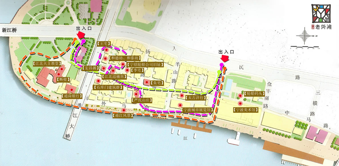 沿著江邊,外國領事館、天主教堂、銀行、輪船碼頭等建筑一字排開,幾乎記錄了寧波開埠的整段歷史。這些建筑,至少有100多年歷史。目前保存下來的文物建筑有:英國領事館、巡捕房、侵華日軍水上司令部、浙海關、天主教堂、江北耶穌圣教堂、寧波郵政局、通商銀行等,還有一些民房,如老字號商鋪“宏昌源號”、中西合璧的商人私宅“嚴氏山莊”、“朱宅”等建筑,這些建筑具有濃郁的歐陸風格。與中國傳統(tǒng)民居形成鮮明對比。經(jīng)過近幾年的培育和扶持,寧波老外灘逐步成為中心城區(qū)的高檔休閑旅游娛樂區(qū)域。