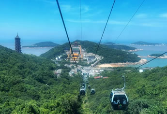 南海觀音立像位于普陀山風(fēng)景名勝區(qū)之東南的龍灣崗巔。這一尊南海觀音立像總高33米,其中臺基高13米,銅像高18米,蓮花座為2米,重70多噸。佛像基層是面積1000多平方的功德廳,上層供奉500尊形態(tài)各異的觀音銅像,下層大廳飾有觀音靈異故事的大型黃楊木雕和以普陀山風(fēng)景名勝區(qū)景色為題材的彩玉浮雕。