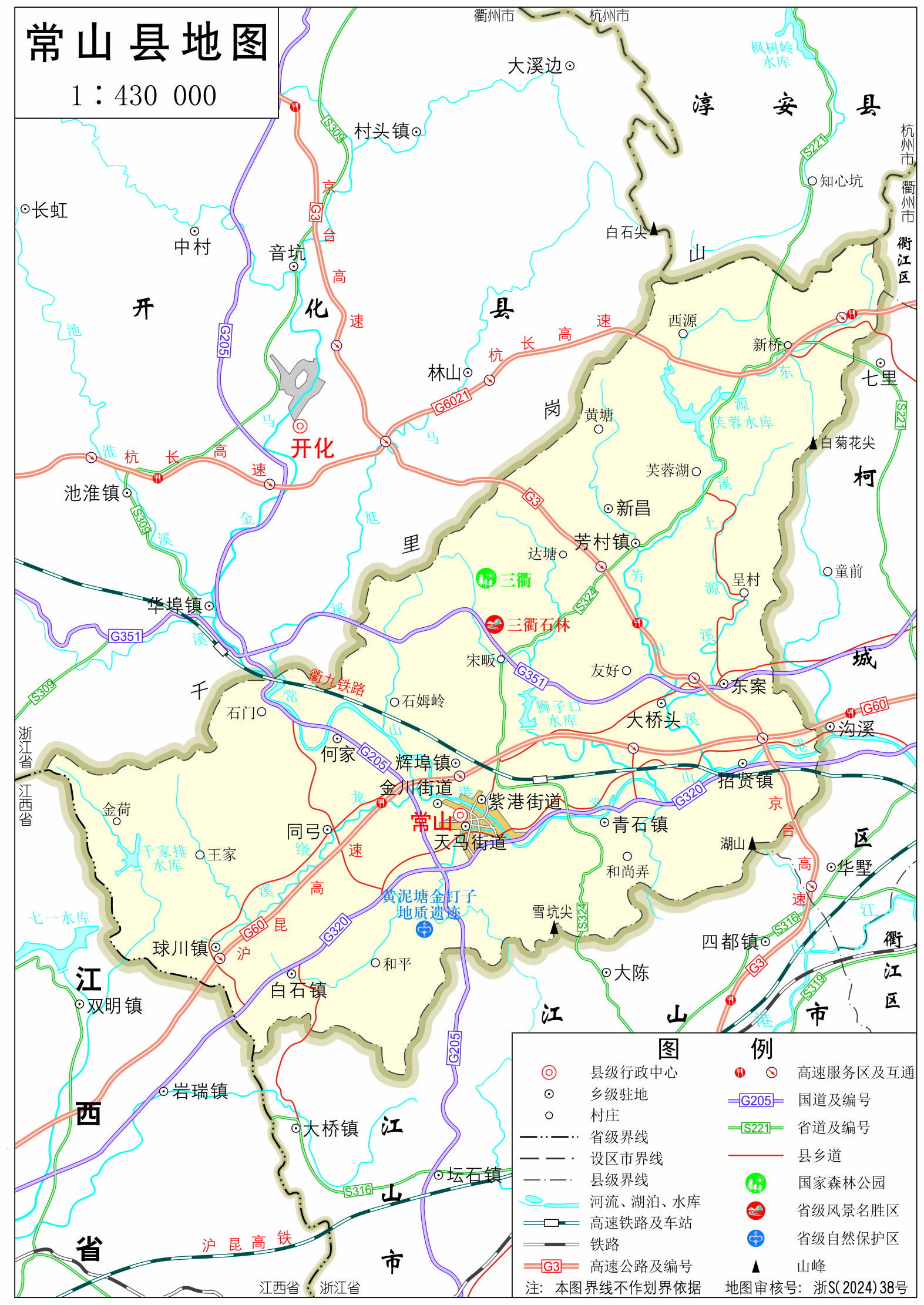 常山縣位于金衢盆地西部、錢(qián)塘江上游,北緯28°51′,東經(jīng)118°30′?偯娣e1099.07平方千米。常山縣地屬浙江省衢州市,毗鄰江西省,區(qū)位獨(dú)特,交通便利,素有“四省通衢,兩浙首站”之稱。周?chē)c柯城區(qū)、衢江區(qū)、江山市、開(kāi)化縣;杭州市的淳安縣;江西省上饒市的玉山縣相接壤,總?cè)丝?2.48萬(wàn),轄7鎮(zhèn)14鄉(xiāng),341個(gè)行政村。城區(qū)天馬鎮(zhèn),建區(qū)面積8.9平方公里,人口9.11萬(wàn)。東漢建安二十三年(公元218年)建縣,始稱定陽(yáng),建縣已近1800年的歷史。