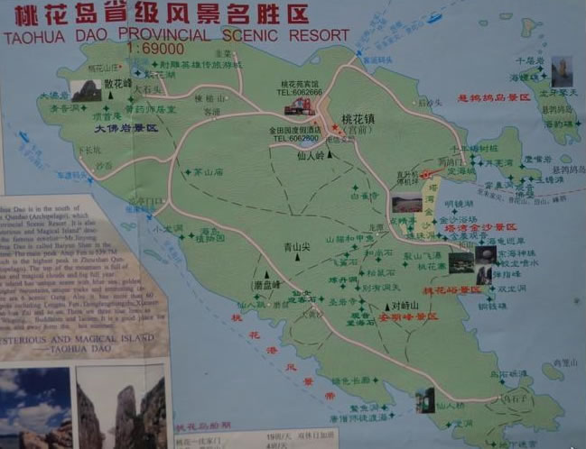 桃花島,擁有舟山群島第一高峰——安期峰;舟山第一深港——桃花港;東南沿海第一大石——大佛巖;是中國三大水仙名品之一的普陀水仙和浙江名茶普陀佛茶的主產(chǎn)地,又是浙江沿海林木品種最多的島嶼,有著“海島植物園”的美稱。其豐富的自然景觀、人文景觀和神話傳說有機融合,形成了六大景區(qū),即:桃花峪景區(qū)、塔灣金沙景區(qū)、安期峰景區(qū)、大佛巖景區(qū)、懸鵓鴣島景區(qū)和桃花港景帶,組合成武俠、佛教、道教文化三條旅游專線。擁有金沙日出、金龍吐珠、安期云霧、高山聞鐘、百家朝圣、山石桃花、奇洞探幽、桃港雄姿、礫灘涌潮、林帶煙樹、龍?zhí)逗熤、大佛夕?2大景觀和大佛巖、彈指峰、東海神珠、清音洞、白雀寺、仙人橋、含羞觀音、龍牙擎天、定海古城、安期煉丹洞等30余處主要景點。