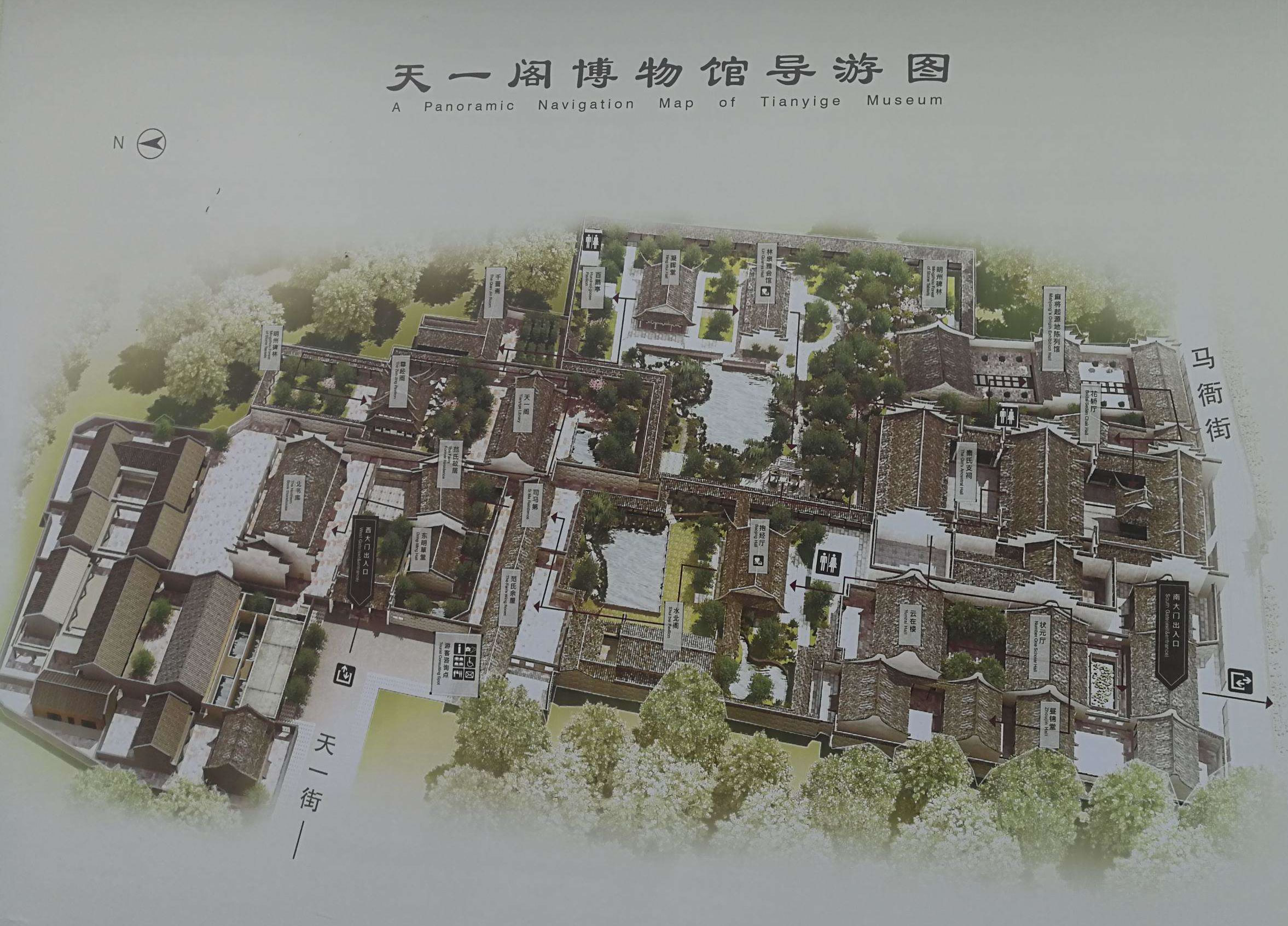 天一閣前為“天一池”通月湖,四周疊砌假山、修亭建橋、種花植草,建筑園林。園林以“福、祿、壽”作總體造型,用山石堆成“九獅一象”等景點。藏書樓西側(cè)生活區(qū)與藏書樓利用防火墻隔開,并使兩者的門錯開。藏書樓周邊擁有大量的安全出口。