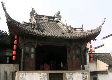 修真觀古戲臺(tái)是道觀的附屬建筑,建于清乾隆十四年(1749),與修真觀一樣屢遭毀損,但民國(guó)八年(1919)年修繕后,便一直保持至今。戲臺(tái)占地204平方米,北隔觀前街與修真觀相對(duì),南臨東市河,東倚興華橋。戲臺(tái)為歇山式屋頂,飛檐翹角,莊重中透著秀逸。梁柱之間的雀替均為精致的木雕,藝術(shù)價(jià)值極高。臺(tái)為兩層,底層用磚石圍砌 ,進(jìn)出有邊門和前門。邊門通河埠,底層后部有小梯通樓臺(tái),亦可通過翻板門從河埠下到船里。樓臺(tái)分前后兩部分,后部是化妝室,雕花矮窗,寬敞明亮;前部是戲臺(tái),正對(duì)廣場(chǎng)。