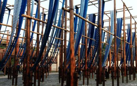 草本染色作坊是手工環(huán)保印染晾曬大型工坊。曬布場(chǎng)地以青磚鋪就,豎立著密密麻麻的高桿和階梯式曬布架,規(guī)模相當(dāng)龐大。草木本色染坊除了以藍(lán)草為原料漿染制作藍(lán)印花布工藝外,還有獨(dú)特的彩烤工藝流程。彩烤色彩豐富,是從當(dāng)?shù)氐牟菽驹现刑崛〉,像茶葉、桑樹皮、烏桕樹葉都是提取色彩的原料,所以這個(gè)染坊在當(dāng)?shù)亟凶霾菽颈旧痉弧?