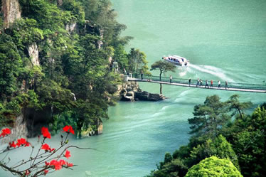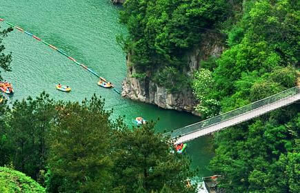 過龍?zhí),潭水平和,為峽谷漂流的登筏之處;懸空橋由鋼索懸架而成,長(zhǎng)近70米,高逾40米,上橋行走,凌空晃蕩,不少游客會(huì)為之發(fā)怵心顫,給人以無(wú)窮刺激,有人稱之為“勇敢者橋”。五星橋頭設(shè)有山貨市場(chǎng),可供應(yīng)大峽谷內(nèi)的各種特產(chǎn)。